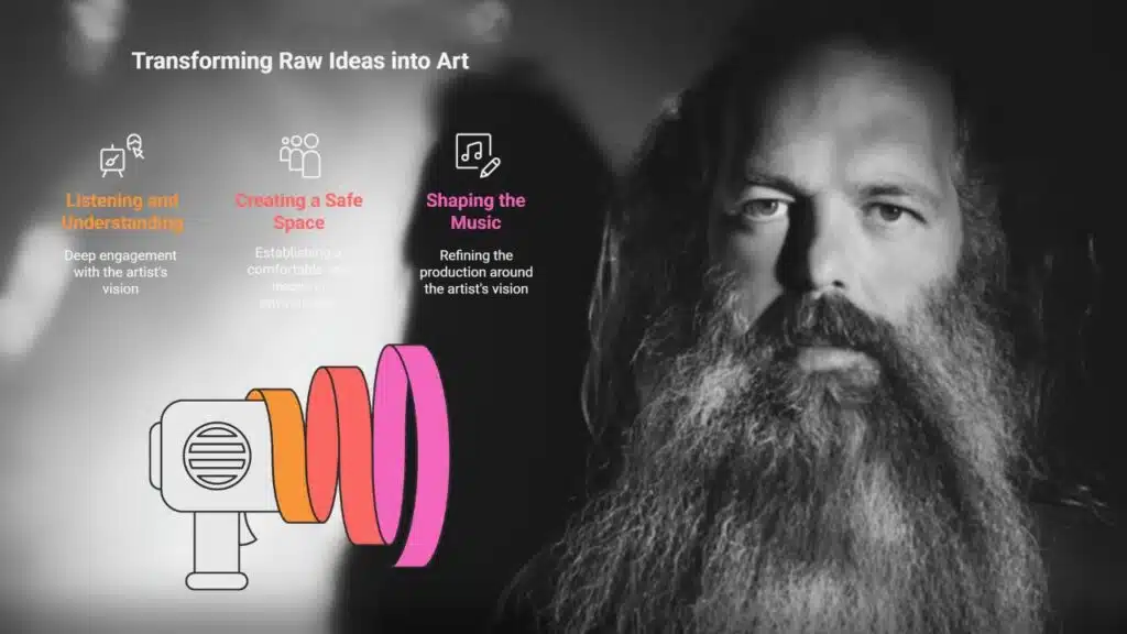 - Rubin treats silence and space as key tools. He makes studios feel calm like a living room in Malibu, uses minimal tracks, and focuses on each artist’s raw emotion and vision.