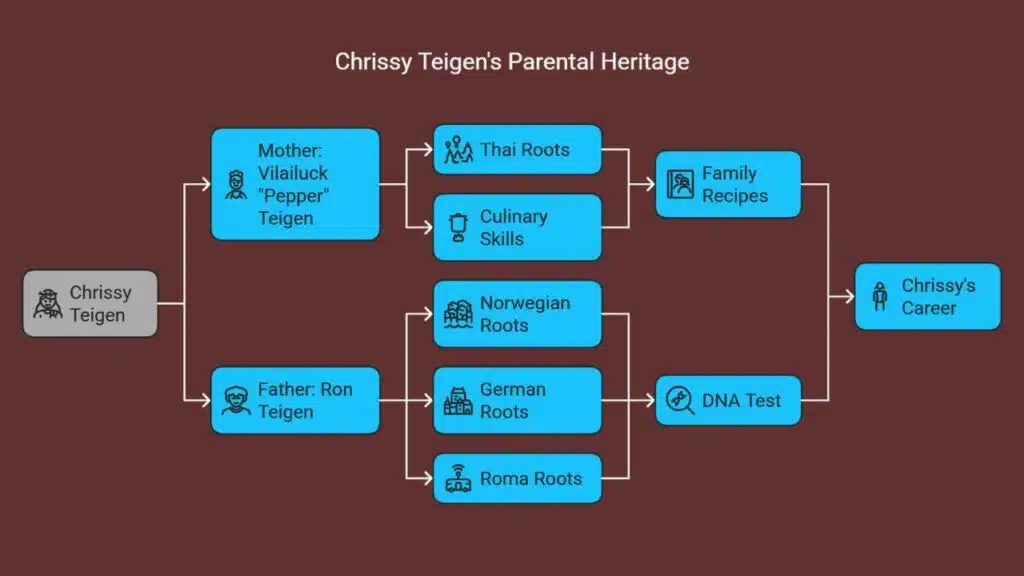 Her mother, Vilailuck “Pepper” Teigen, hails from Asia and can light up a kitchen with fiery curries. Her father, Ron Teigen, blends Northern European, Central European, and Roma roots, revealed by a DNA test on Finding Your Roots with Henry Louis Gates Jr.