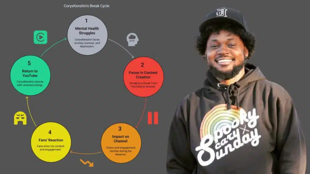 CoryxKenshin, a well-known American YouTuber, has stepped away from his YouTube channel multiple times. These breaks often tie to his mental health struggles. He’s been open about facing anxiety, burnout, and depression.