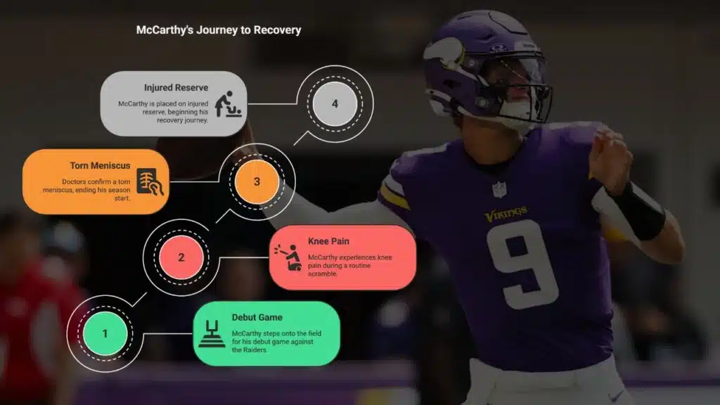 Key milestones include light training camp drills by early next year. Sam Darnold steps up as starter now, but McCarthy’s rookie quarterback fire waits for that green light. Think of it as a long hike back to the field, one steady pace at a time.