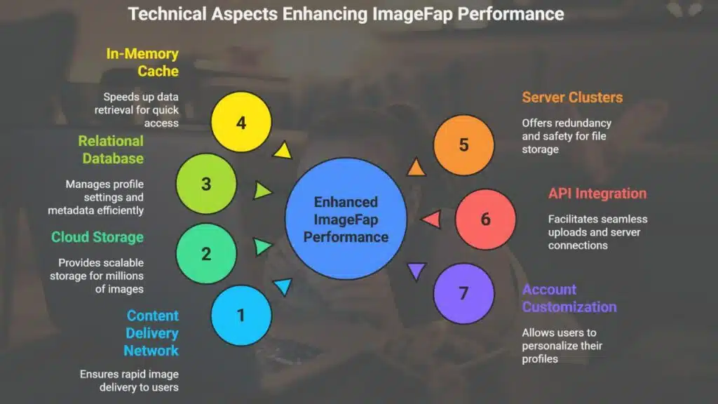ImageFap taps a content delivery network and cloud storage so your pics race to your screen. A relational database and in-memory cache keep profile settings and metadata humming along.