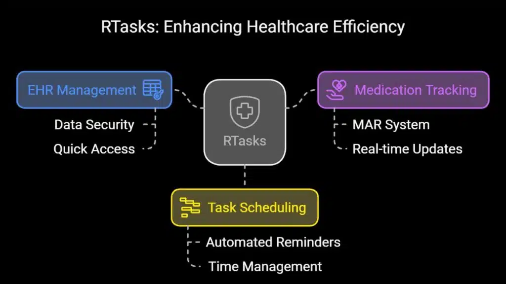 RTasks stands out with its smart tools. It makes taking care of health records easy and keeps track of medicines well. It also plans tasks without a fuss. This helps doctors and nurses do their jobs better and faster.