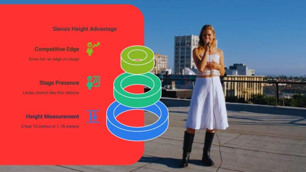 This post lists Siena’s true height. At five feet ten inches, she towers over many. Her height helps her stage presence shine. She blends ballet grace with singing power. Her drama training adds to her stage poise.