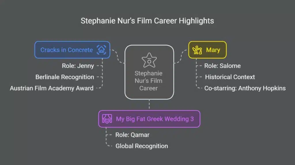 In “Cracks in Concrete”, viewers saw a story set in Austria. This movie gave Stephanie Nur a chance to show her skills right from the start of her career. Winning an award made people pay more attention to her talent early on.