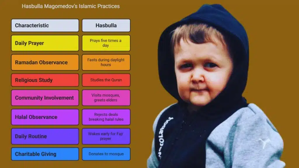 Hasbulla Magomedov greets fans with a Quran verse. He prays five times per day. He shares charity videos online. He posts prayer reminders on Instagram and TikTok. Media habits shape his honest, faith-driven image.