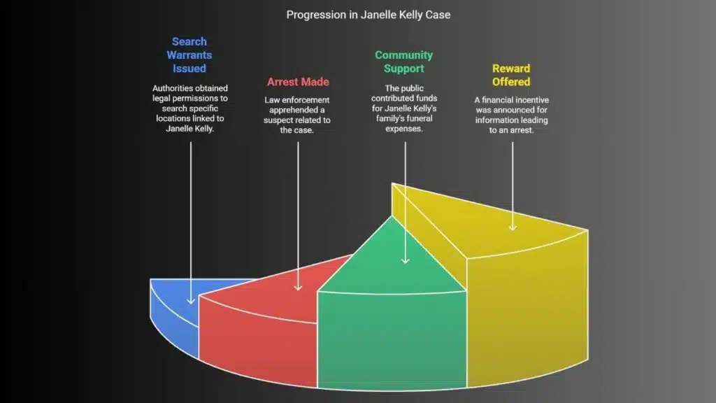 Search teams looked for clues about Janelle Kelly. They got search warrants for places linked to her. This led to an arrest. The police didn’t share what they found, wanting the investigation to go smoothly.