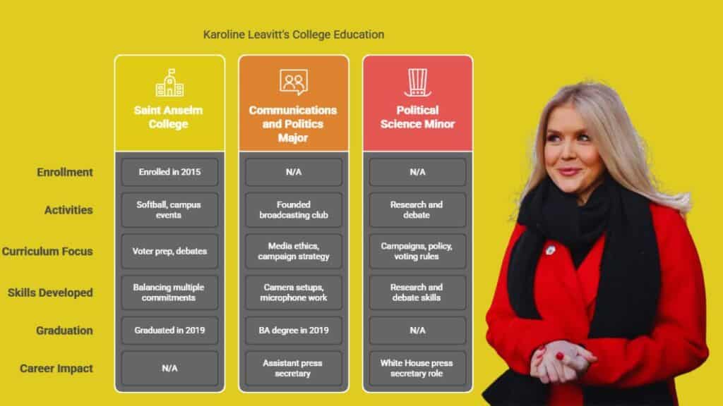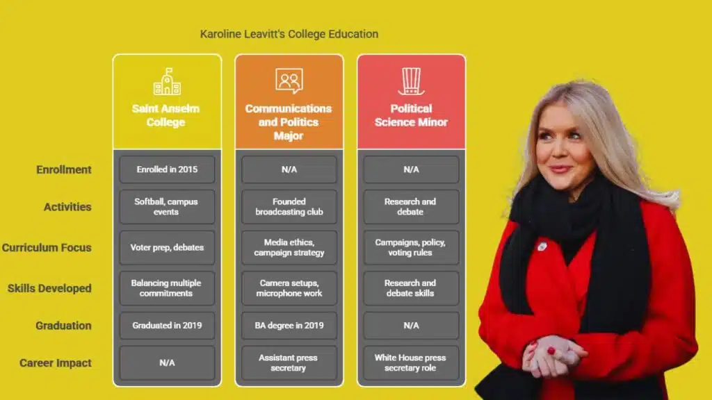 Karoline Leavitt added a political science minor at Saint Anselm College, a liberal arts school in Manchester. That track let her explore campaigns, policy, and voting rules. Professors at the New Hampshire Institute of Politics shared tales of tax cuts debates and republican primary contests.
