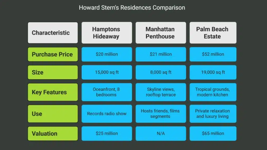 - All three properties include smart-home tech, high-end finishes, and tight security. Stern records parts of The Howard Stern Show at these homes, reflecting his celebrity net worth and media roots.