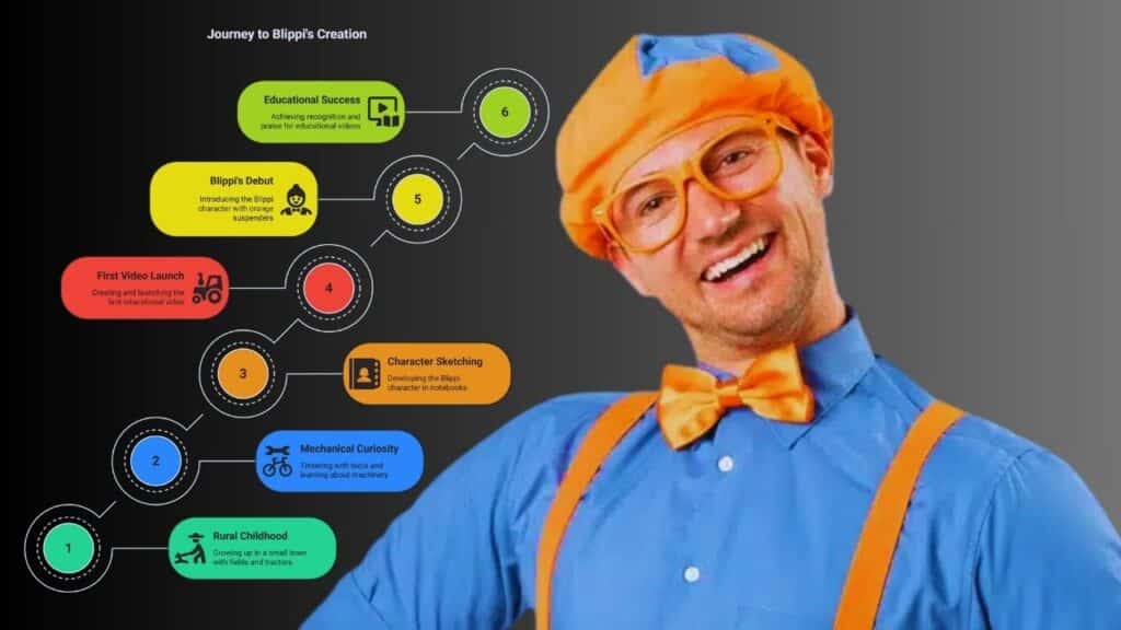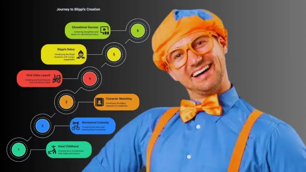 Childhood chores built grit and curiosity. He sketched ideas for a character in 2013, just for his two-year-old nephew. That spark led to the Blippi character and playful style. He donned orange suspenders, a blue cap, and an eager grin.