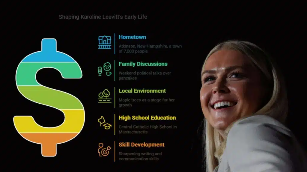 She grew up in Atkinson, New Hampshire. It’s a cozy town near forests and farms. It shaped her small-town grit before she became the youngest White House Press Secretary.
