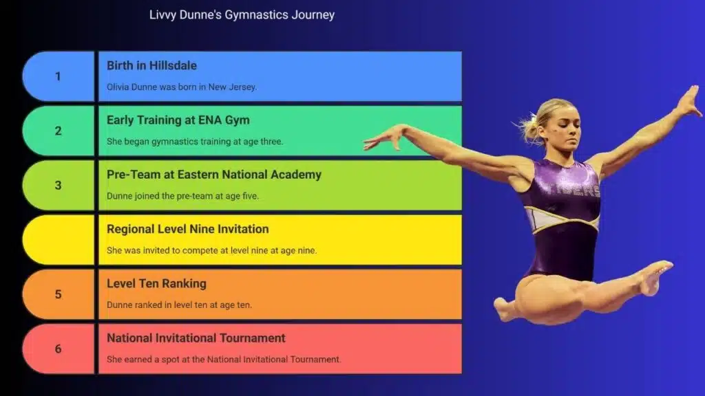 Livvy Dunne grew up in Hillsdale, New Jersey. She started gymnastics at age three and trained at Eastern National Academy, then joined the LSU Tigers for NCAA championships. We will trace her path from hometown to uneven bars and floor exercise star, share her SEC and academic honors, her name, image and likeness deals, and her Instagram rise.
