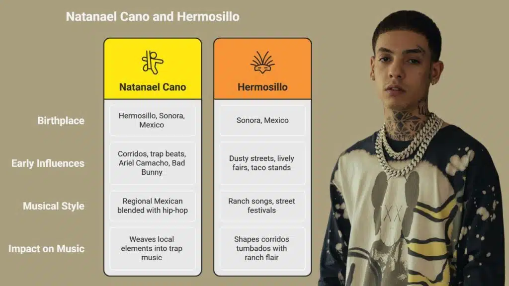 Local radio blares ranch songs in Hermosillo, the Sonoran capital. This city sits in Sonora, Mexico, under a hot sun. He grew up amid taco stands and family fiestas. These scenes pepper his corridos tumbados with ranch flair, like a colorful mural.
