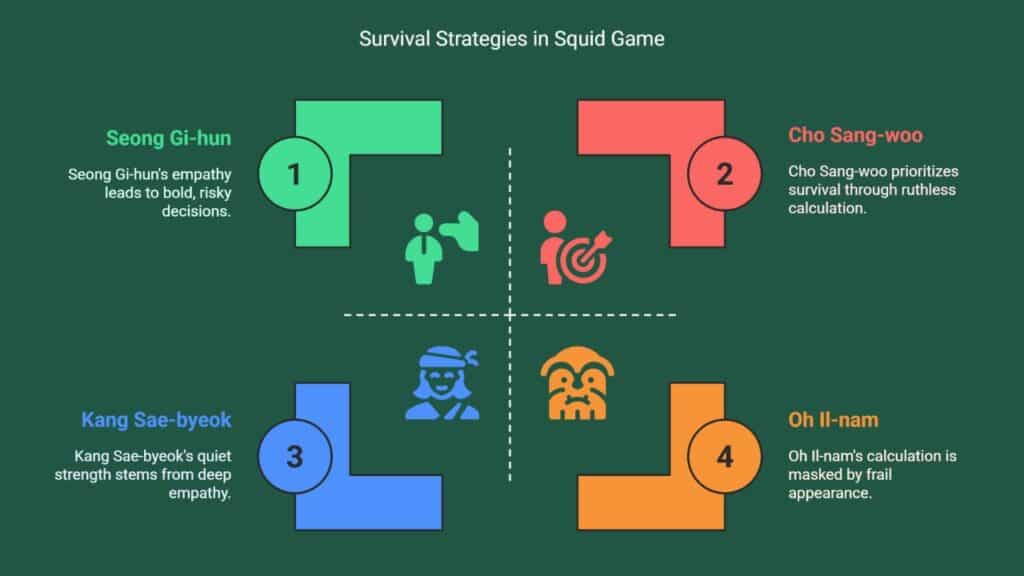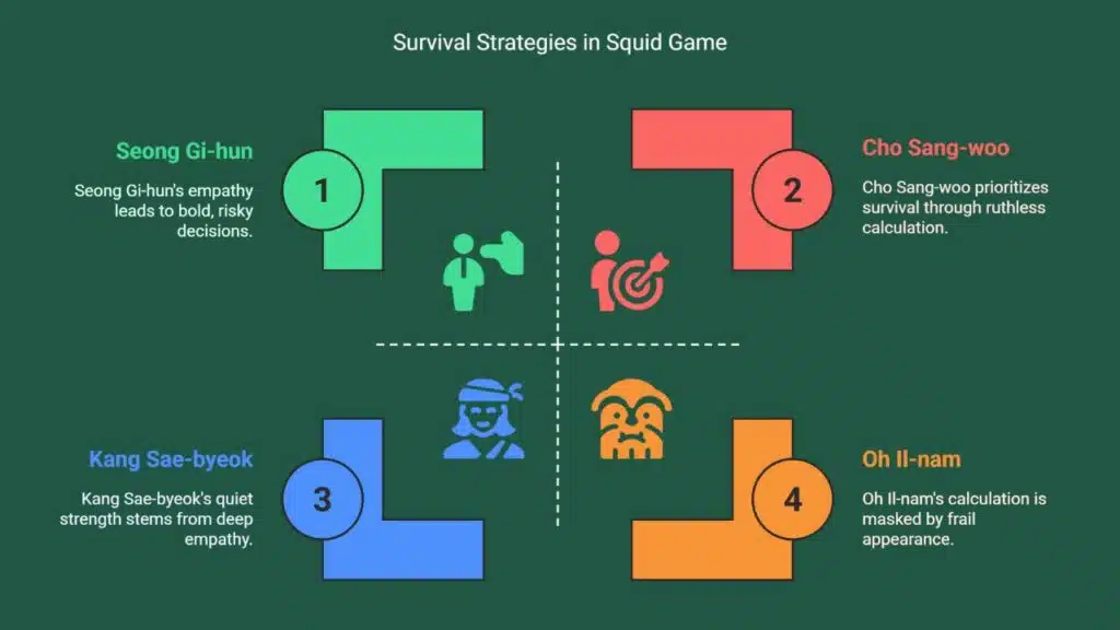 - Main character types include Gi-hun’s optimism, Sang-woo’s calculated thinking, Sae-byeok’s independence, Ali’s trust, and Il-nam’s hidden wisdom.