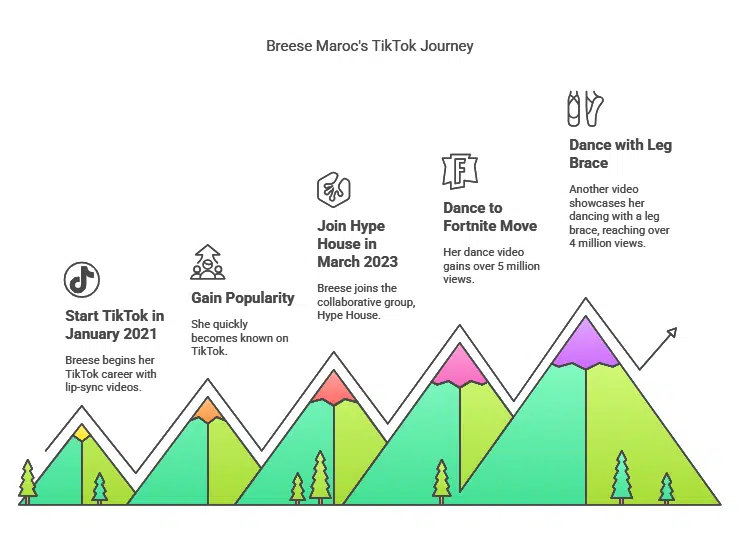 Breese Maroc, from the US, became a big star on TikTok in 2021. She shares videos where she dances or lip-syncs to songs. With her work, she joined the Hype House and got a lot of people to follow her online.
