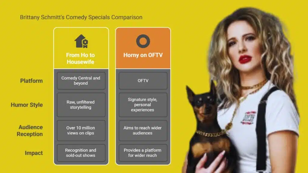 Brittany Schmitt’s breakout special “From Ho to Housewife” showcased her raw, unfiltered storytelling style that made audiences both cringe and laugh out loud. Her fearless approach to taboo topics, combined with sharp wit about relationships and personal growth, earned her recognition on Comedy Central and beyond.