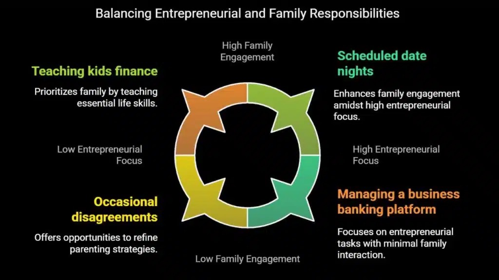 Family life and ambitions mix with care in their home. The startup dad and his wife work as a team. They balance work, running a company, and teaching kids finance. Each step builds more energy and time for all.