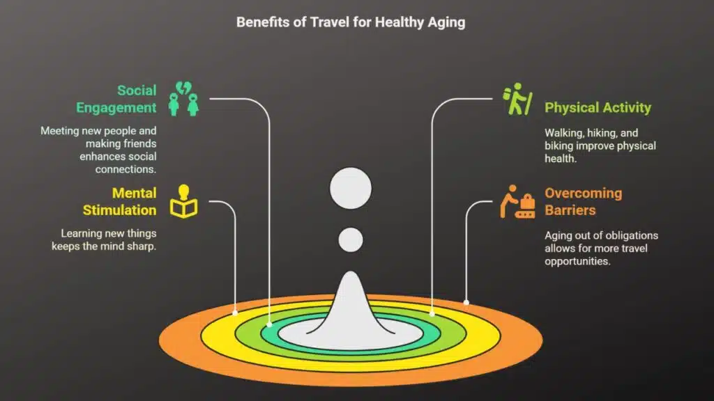 Everyone wants to age gracefully. Factors that lead to healthy aging include proper diet and nutrition, social engagement, exercise, and keeping your mind sharp. Travel can help you achieve almost every one of those.
