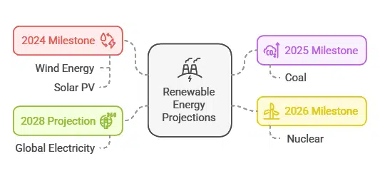 The International Energy Agency (IEA) forecasts several significant milestones for renewable energy in the coming years: