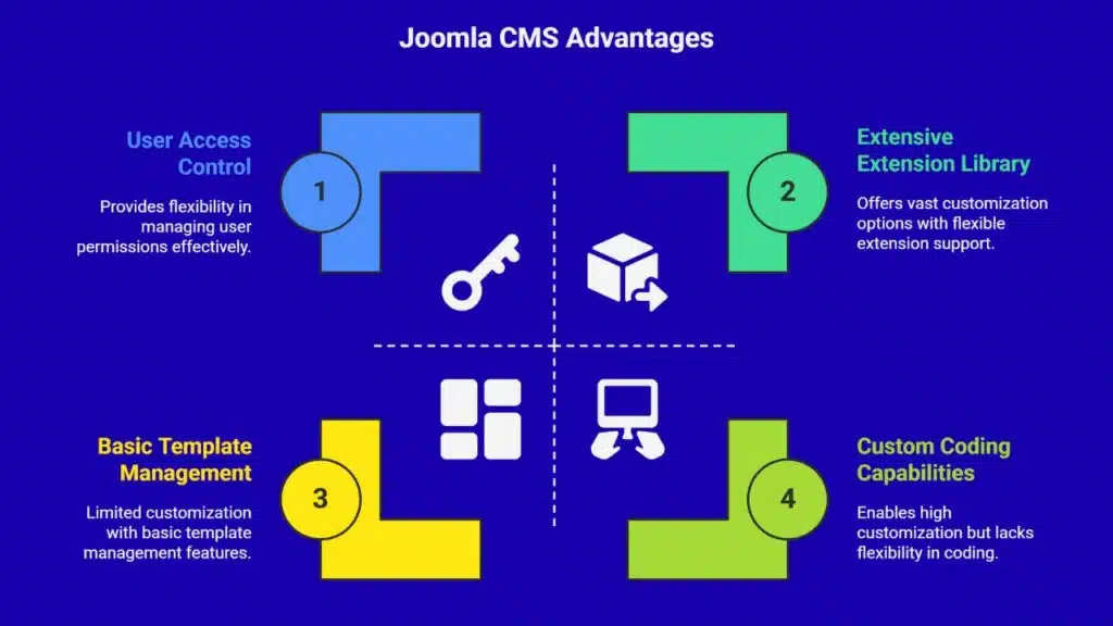 Developers add over 8,000 joomla extensions to expand features. It grants user access control and multilingual support. These tools serve global businesses that need advanced content rules.