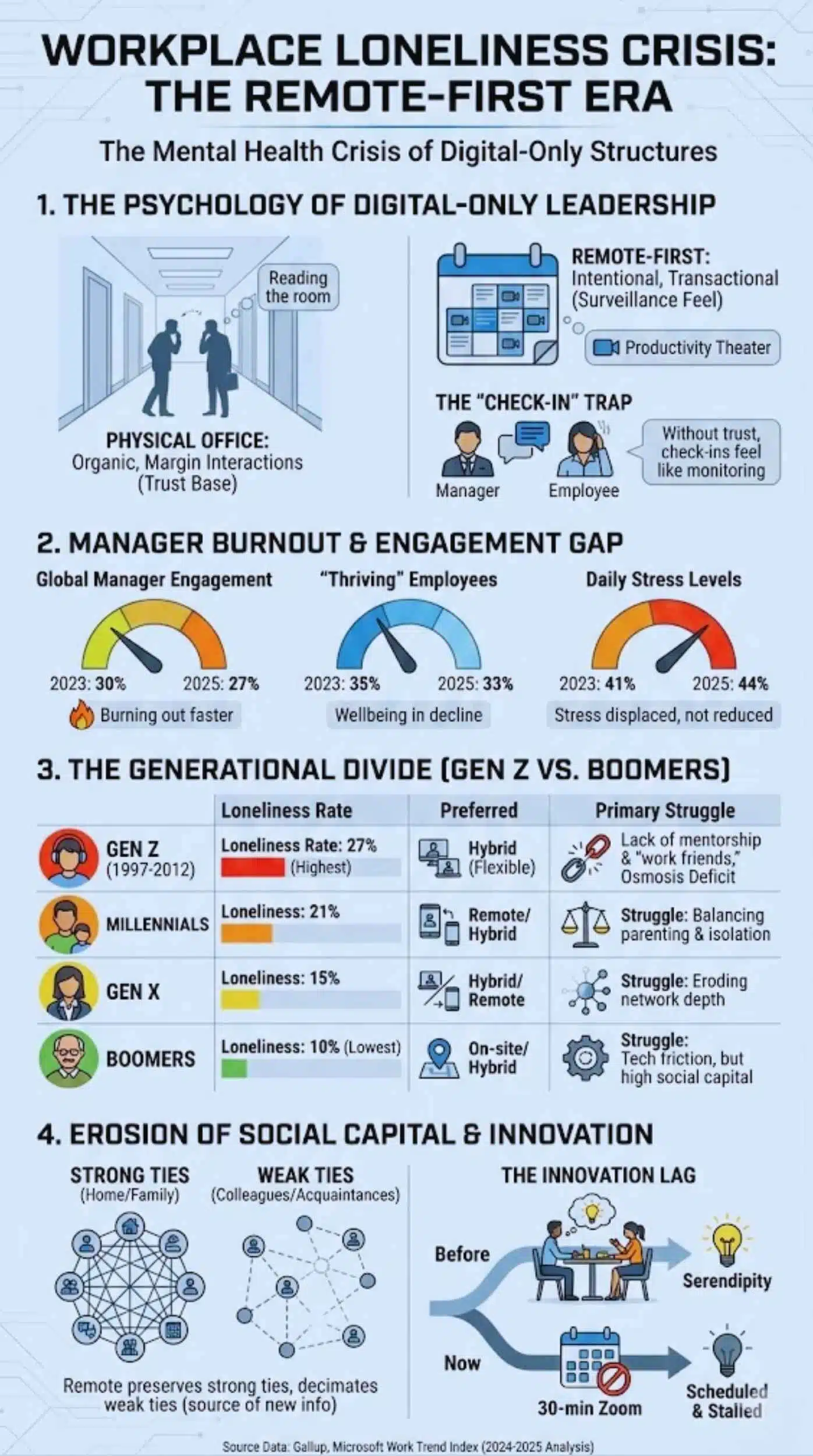 | Generation | Loneliness Rate (“A Lot of the Day”) | Preferred Work Model | Primary Struggle |